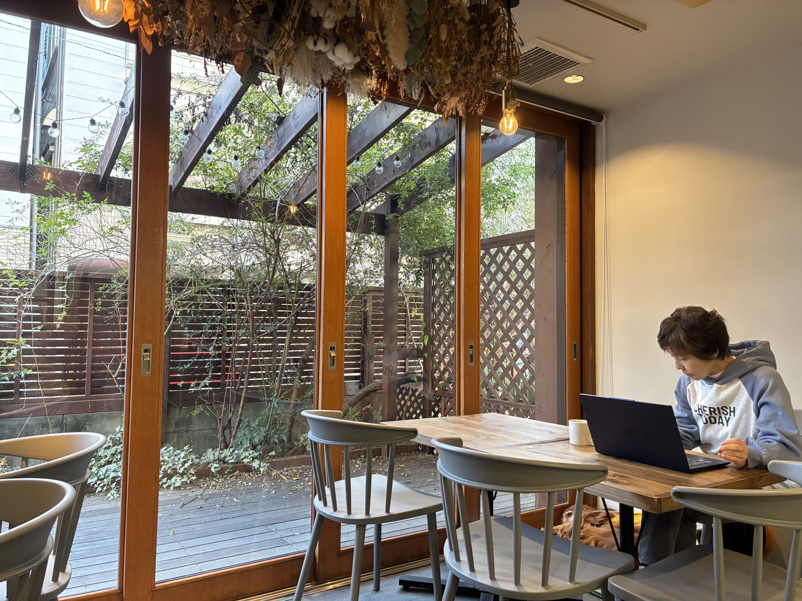 手前のカフェスペースは大きな窓から自然光がたっぷり入り、